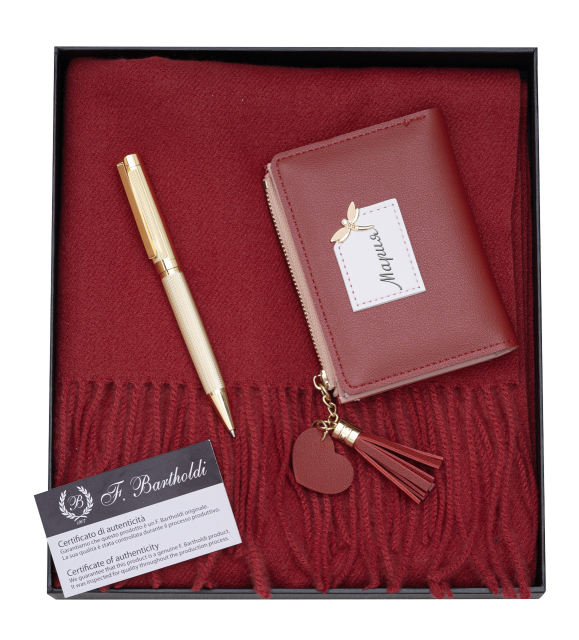 Дамски подаръчен комплект съставен от шал, химикалка и портмоне в красива подаръчна кутия. Портмонето е с гравиран персонален надпис.