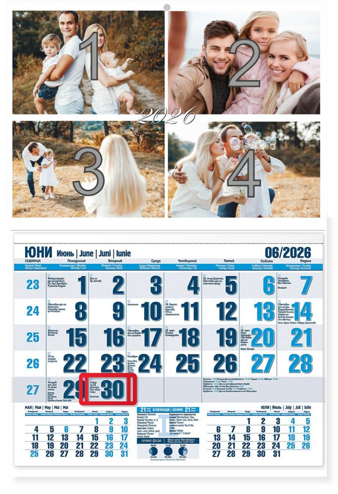 Работни календари с Ваши снимки. Във варианта са включени 4 хоризонтални снимки. Ако условието не е изпълнено, не носим отговорност за качеството на крайния продукт.