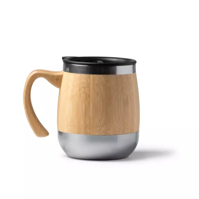Двустенна чаша от неръждаема стомана с бамбуково покритие и ергономична дръжка. Подходяща както за топли, така и за студени напитки, с вместимост 450 мл. Капакът осигурява удобство при употреба и предотвратява разливане. Идеална за офис, дом или в движение.