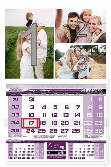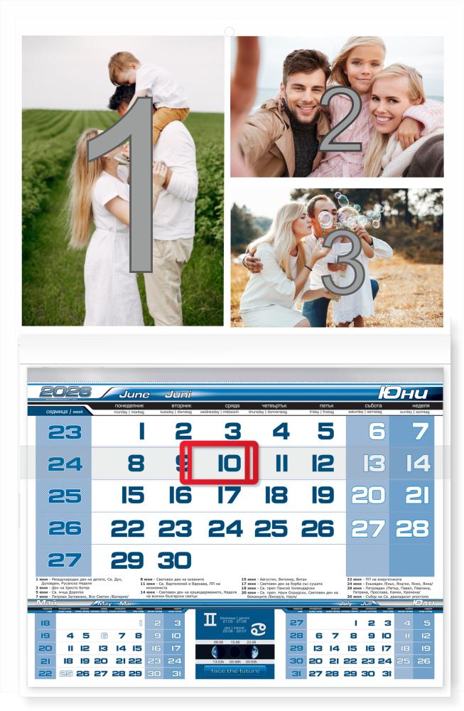 Работни календари с Ваши снимки. Във варианта са включени 1 вертикална и 2 хоризонтални снимки. Ако условието не е изпълнено, не носим отговорност за качеството на крайния продукт.